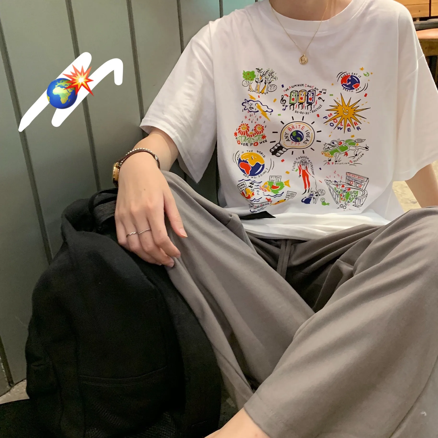 BEST Photo Shoot Summer New Style Hong Kong Style Printed Mid-length BF Style Loose Short Sleeve T-shirt