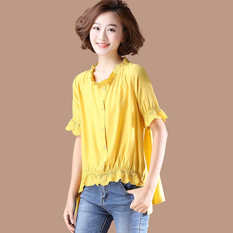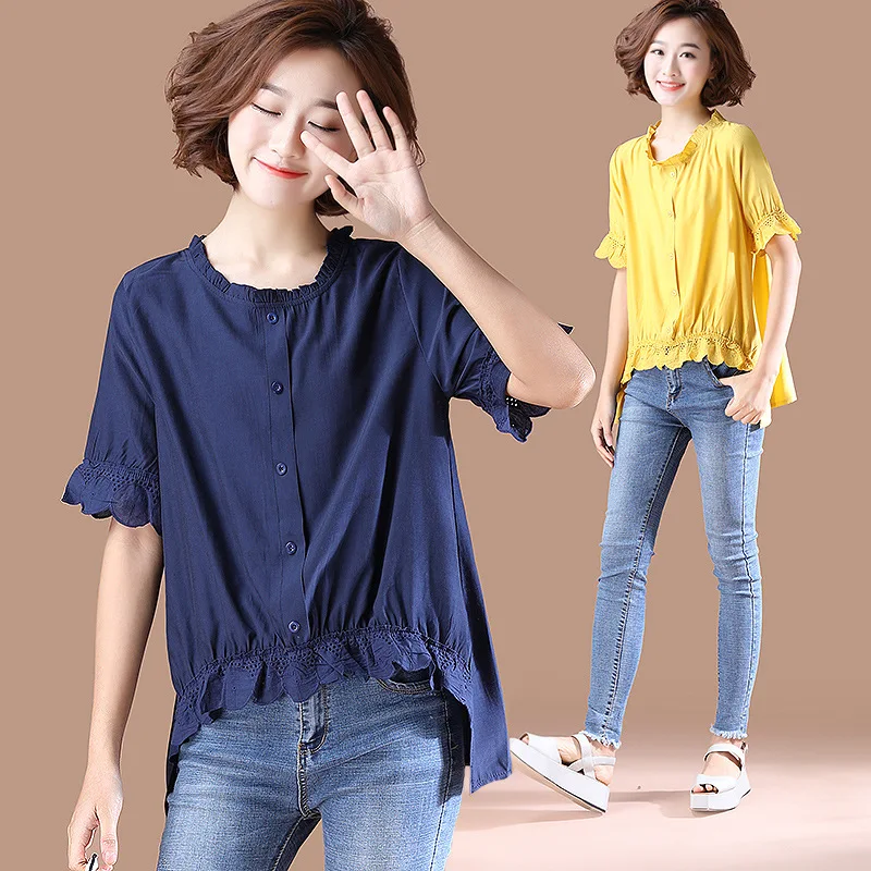Best Quality Photo Shoot 2019 Summer New Style Large Size Fat Mm Frilled Short Sleeve Solid Color Tops Women's