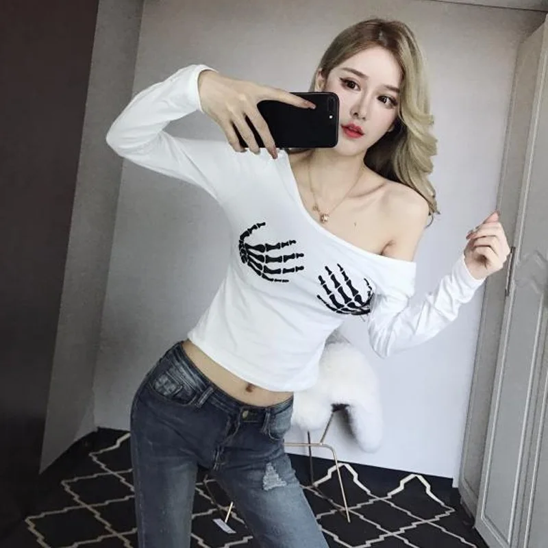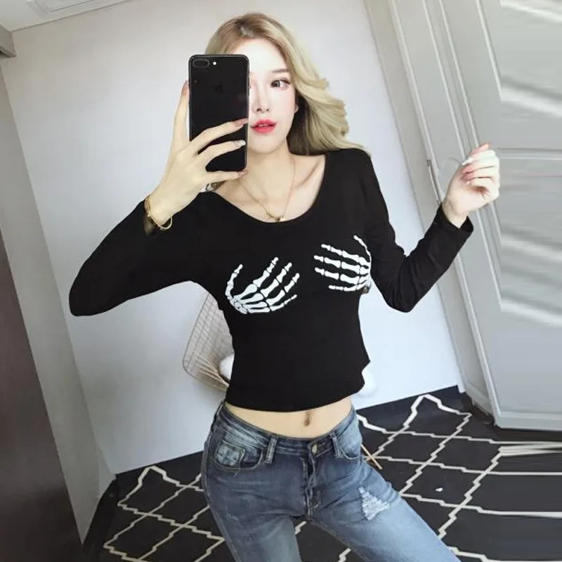 HOT SALE Photo Shoot ~ Autumn Sexy Sense of Design Cool Ghost Hand Printed Base Long-sleeved T-shirt Tee Sho