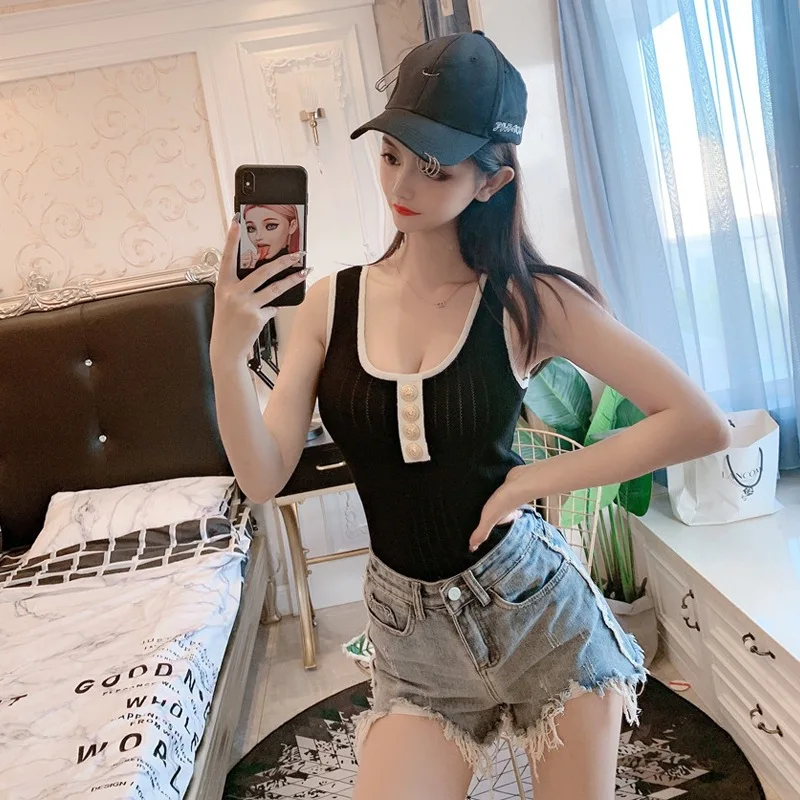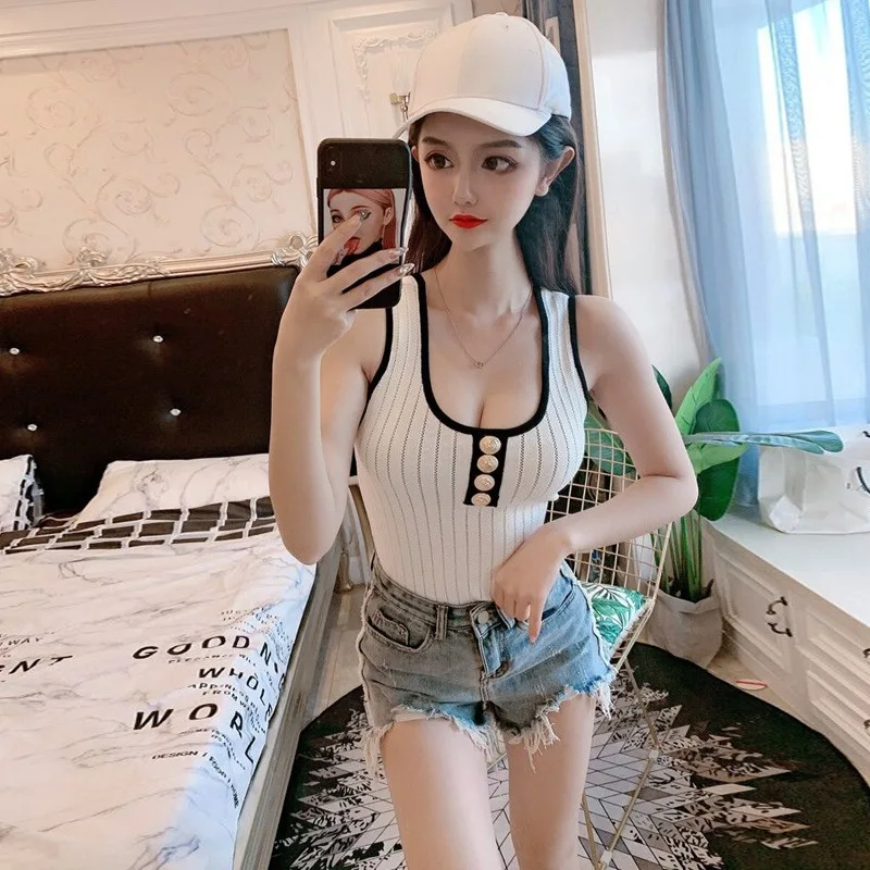Photo Shoot ~ Summer Online Celebrity Sexy Evening Show Knitted Gold Button Front And Back Low Coll